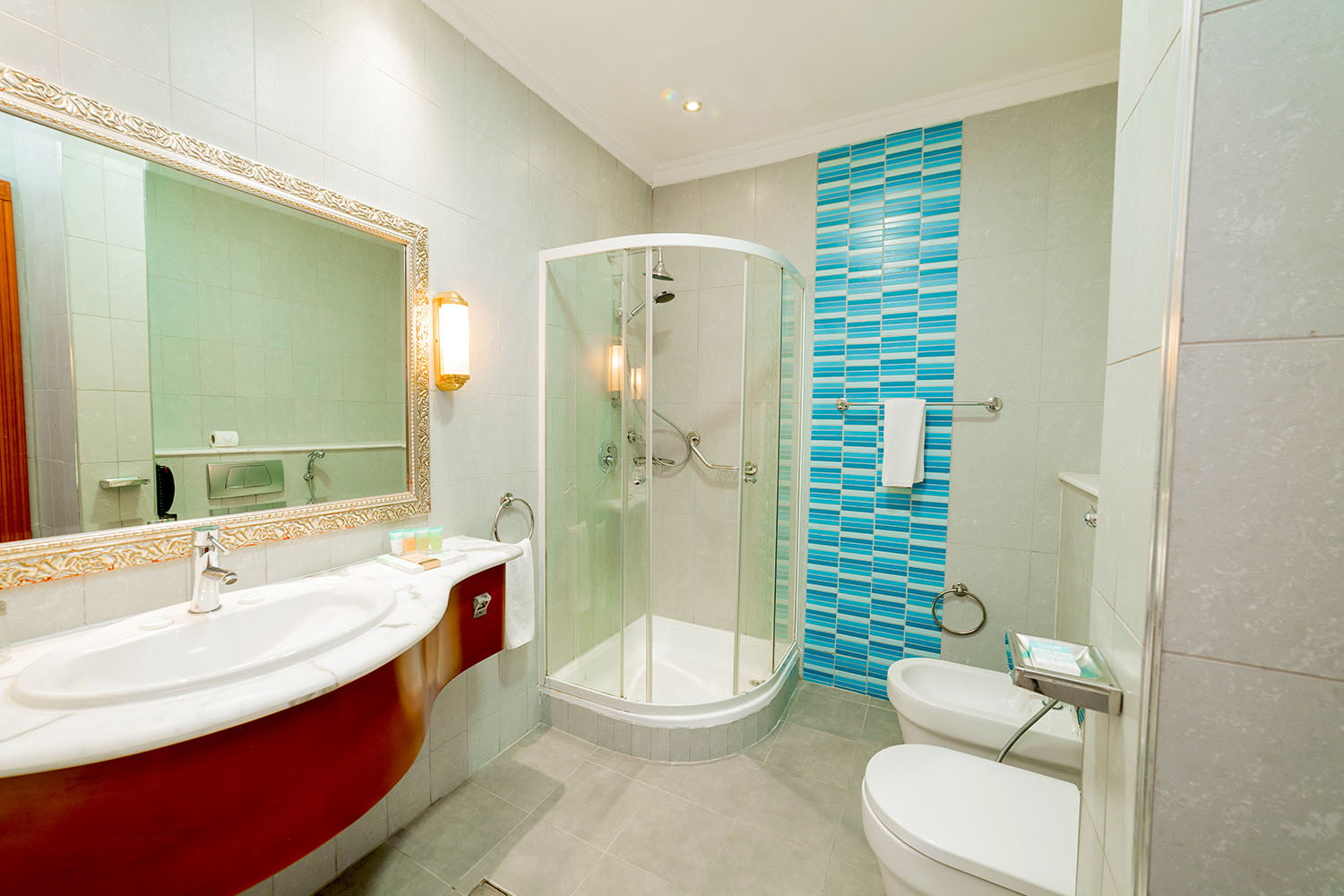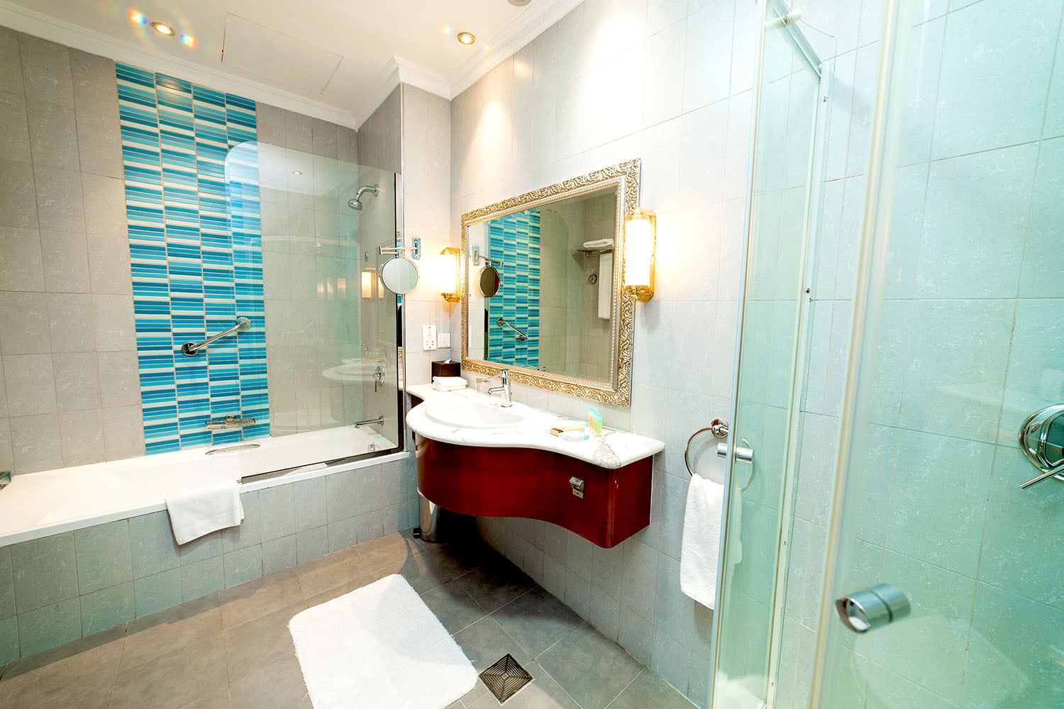 The oversized bathroom, appointed in marble with mahogany furnishings, is designed for maximum comfort, reflecting the elegance of a Luxury Hotel in Al Barsha. Guests can enjoy a bathtub with a separate walk-in shower, sink with vanity counter, bidet, and toilet.